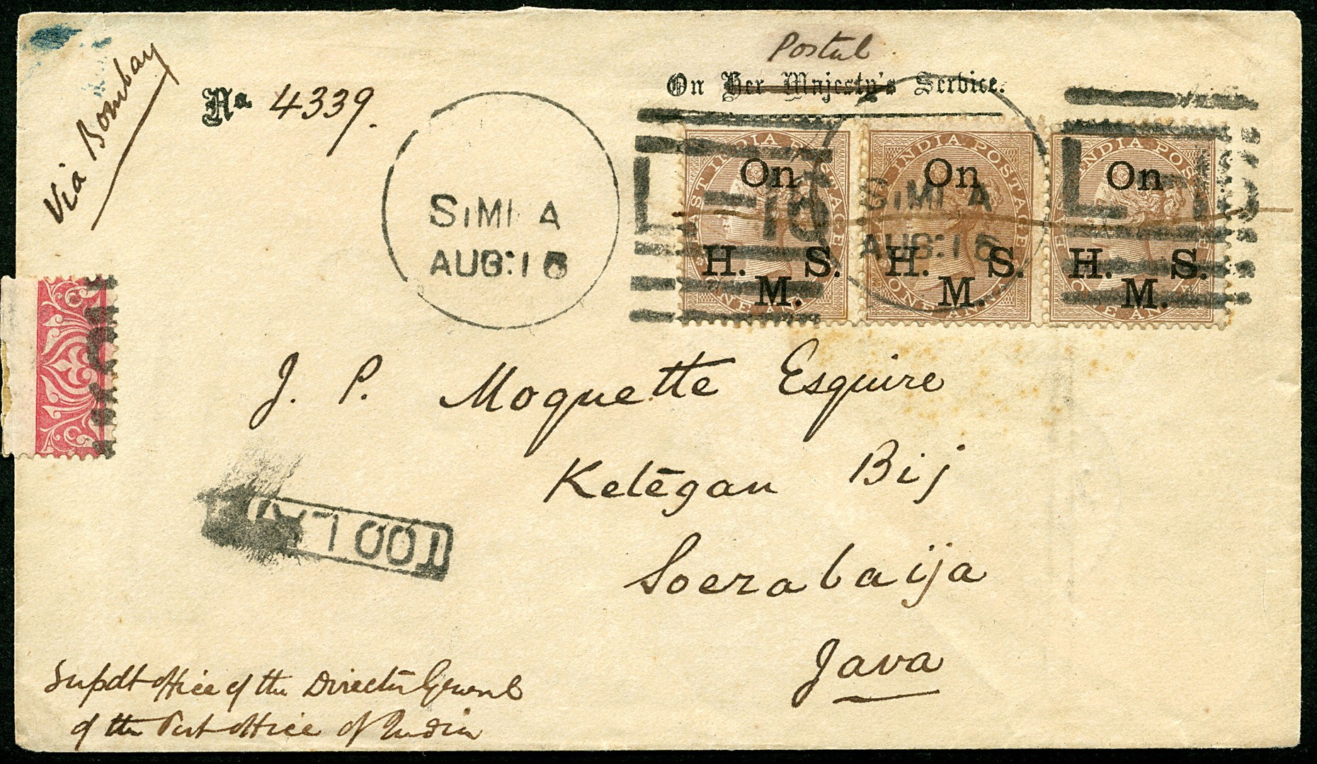 INDIA. Env. gefr. met drie dienstzegels van 1a. SG.O40 afgest. SiMI A 10-8 met op vz. ´TOO LATE´ via Bombay 21-8-1879, Singapore 13-9 en het N.I.Exp.Kr. Singapore 13-9 naar Soerabaja 20-9