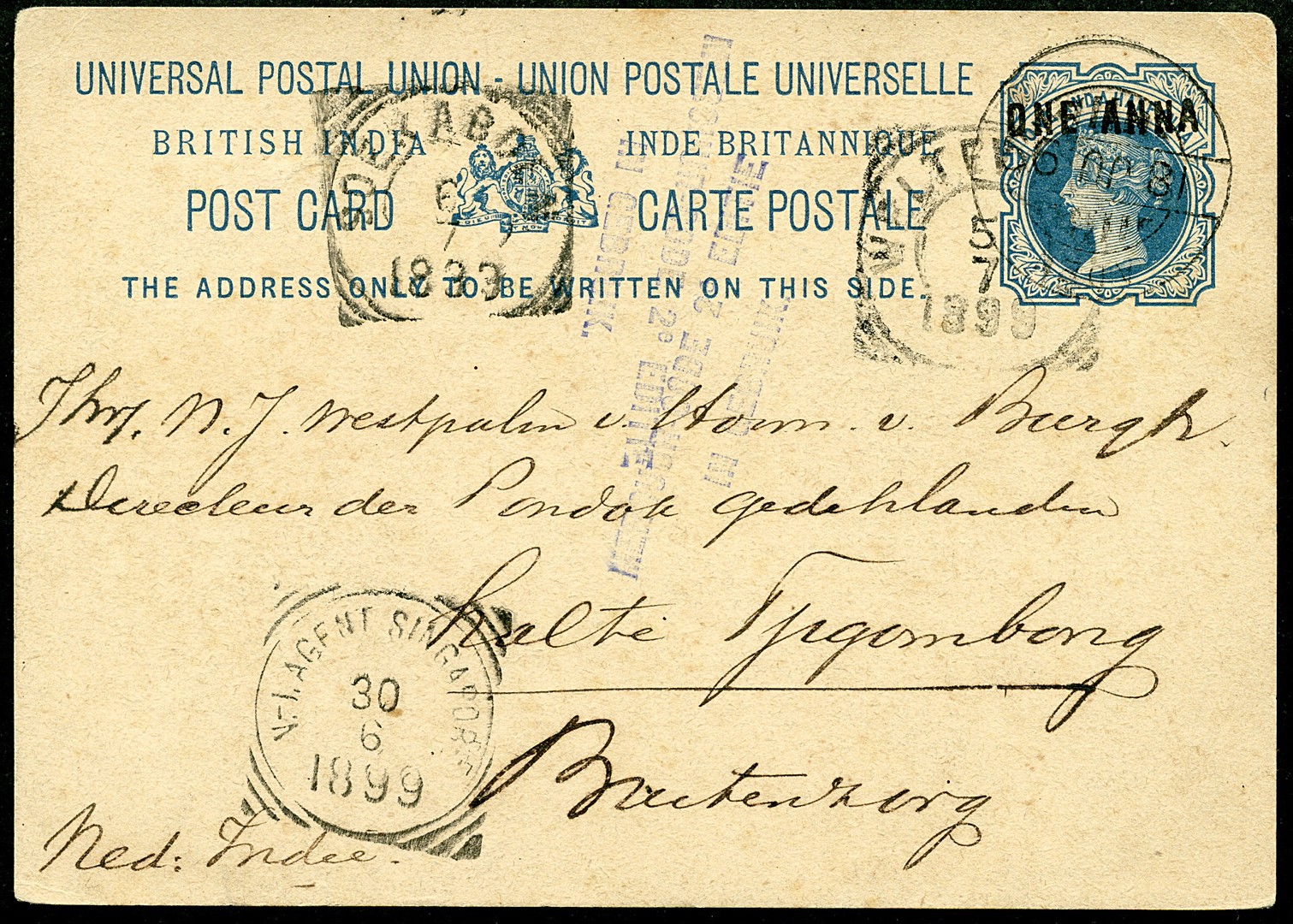 INDIA. Vijf bk. van 1a op 1½a, uit Darjeeling (1892), Vizagapatam (1897), twee uit Aden aan de kust van Jemen (1896, 1897) en uit Perim, een strategisch gelegen eilandje tussen Jemen en Djibouti (1899