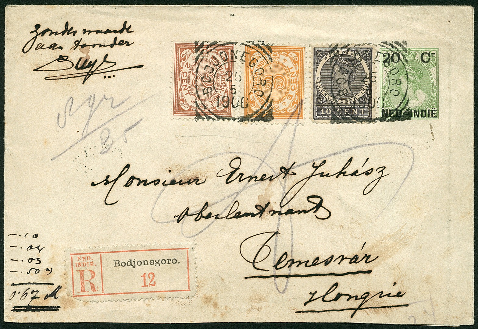 Env. G.17 met bijfrankering nrs.42, 44 en 48 'zonder waarde aan toonder' aangetekend verzonden van Bodjonegoro 25-5-1906 naar Temesvar-Hongarije 25-6