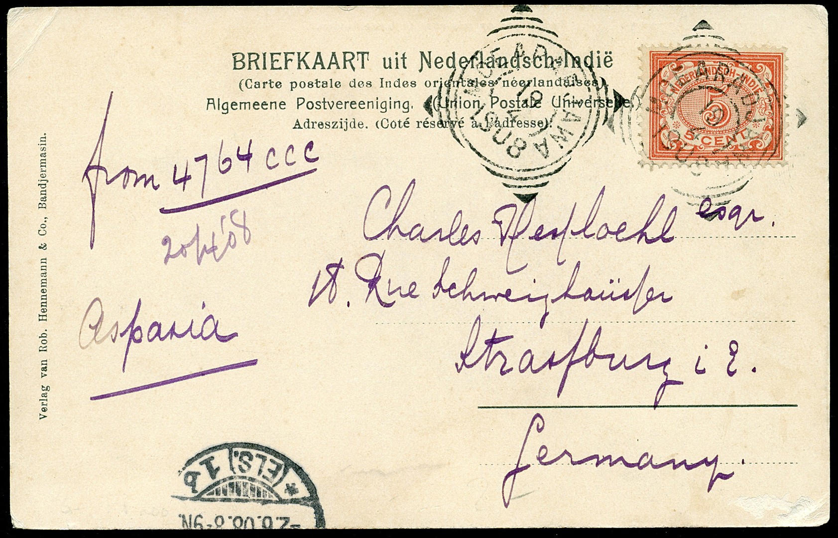 MOEARADJAWA op prentbk. gefr. met 5c op 19-4-1908 naar Duitsland (SvL 225)