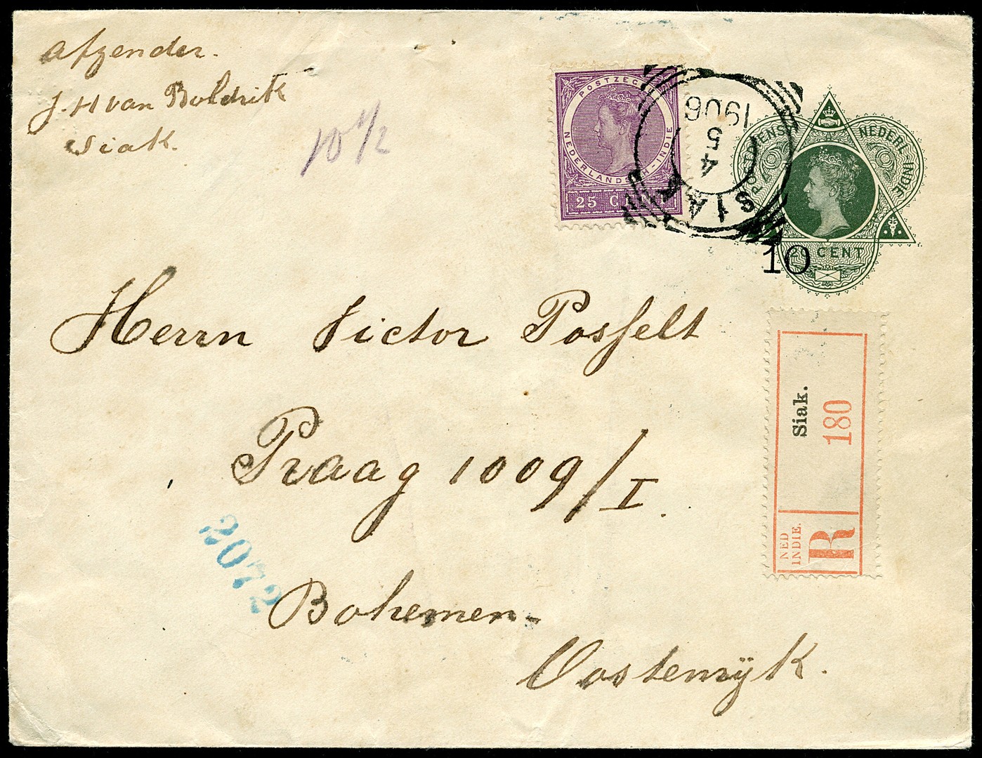 SIAK op env. G25 bijgefr. met 25c Veth aangetekend op 4-5-1906 over de N.I.Agent Singapore 8-5 naar Praag 1-6. Uitermate zeldzaam als aangetekend poststuk! (SvL 350++)