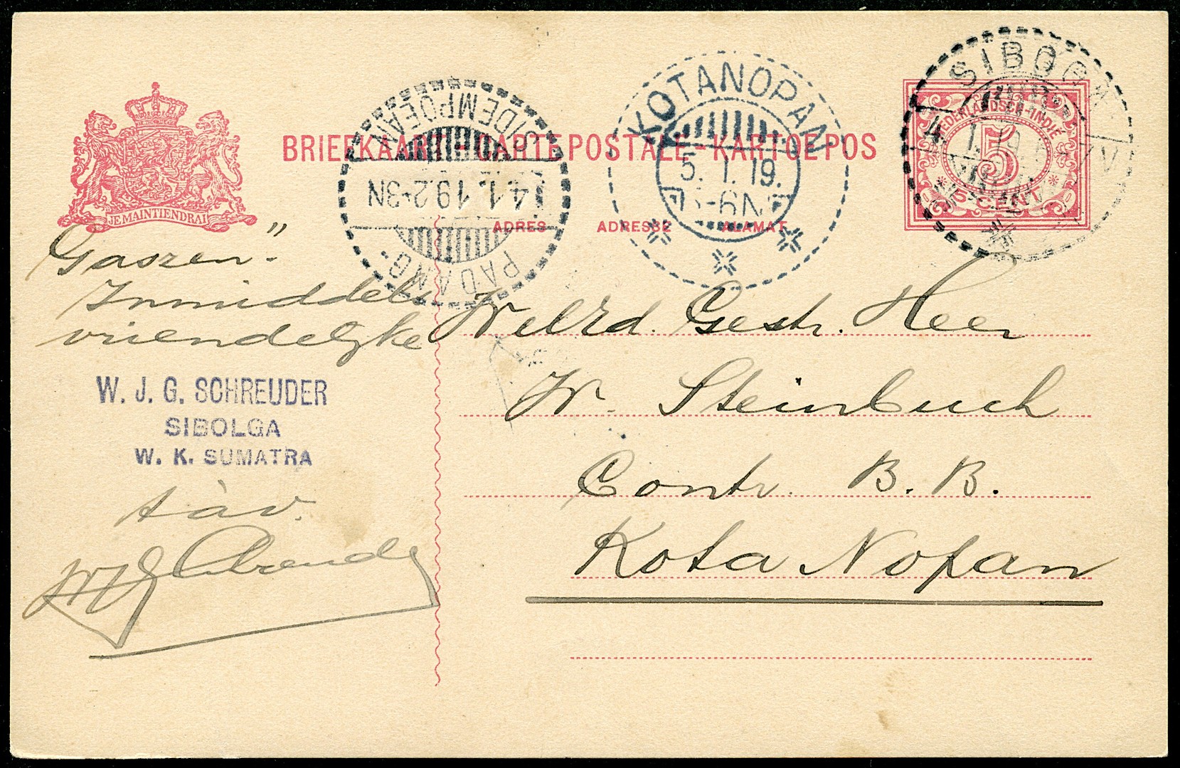Drie 5c bk. regionaal verz. met luxe aankomststempel Kotanopan van 3, 5 en 8-1-1919 (KBU)