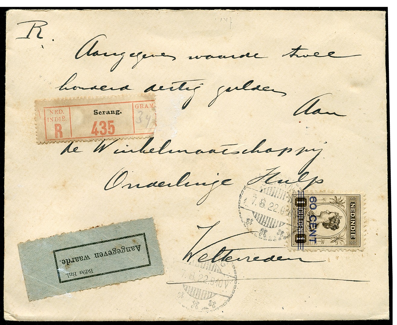 Valeur. Env. van de Resident van Bantam van 34 gram waarop 60c nr. 147 als enkelfrankering (schaars!) met aangegeven waarde van fl. 230 van Serang 7-8-1922 naar Weltevreden 7-8 met blauw strookje (als Bu. type 4 maar blauw)