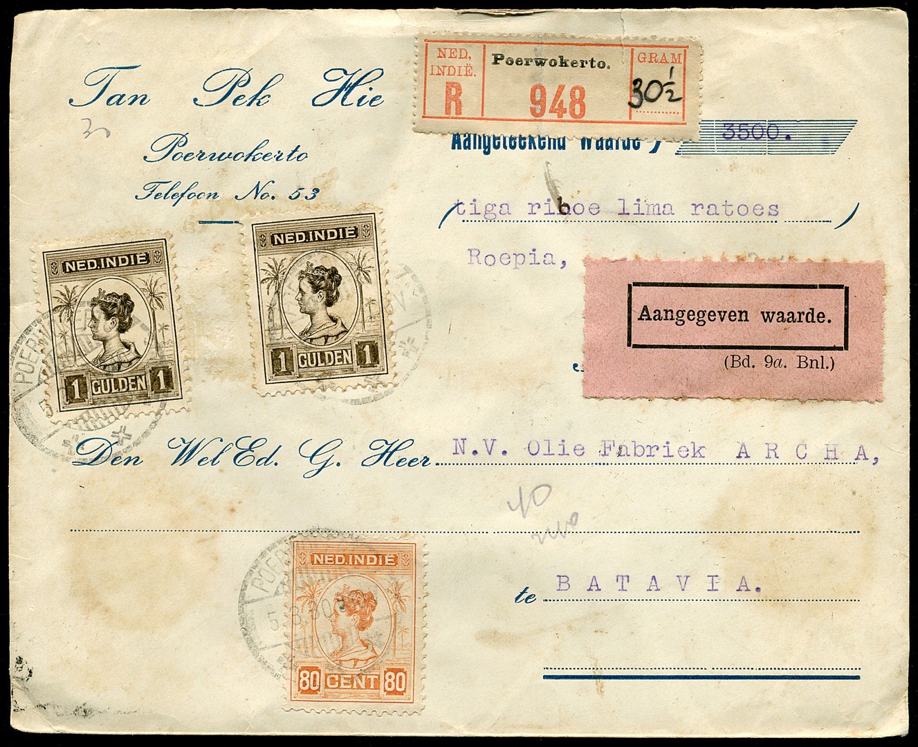 Valeur. Drie enveloppen van handelaar Tan Pek Hie uit Poerwokerto uit 1927-30 met aangegeven waarde van fl. 1000 (12 gram, 102½ port, donkerroze strook Bu. type 7), fl. 2274 (30 gram, 200 port, roze strook Bu. type 7) resp. fl. 3500 (30½ gram, 280 port, roze strook Bu. type 7)