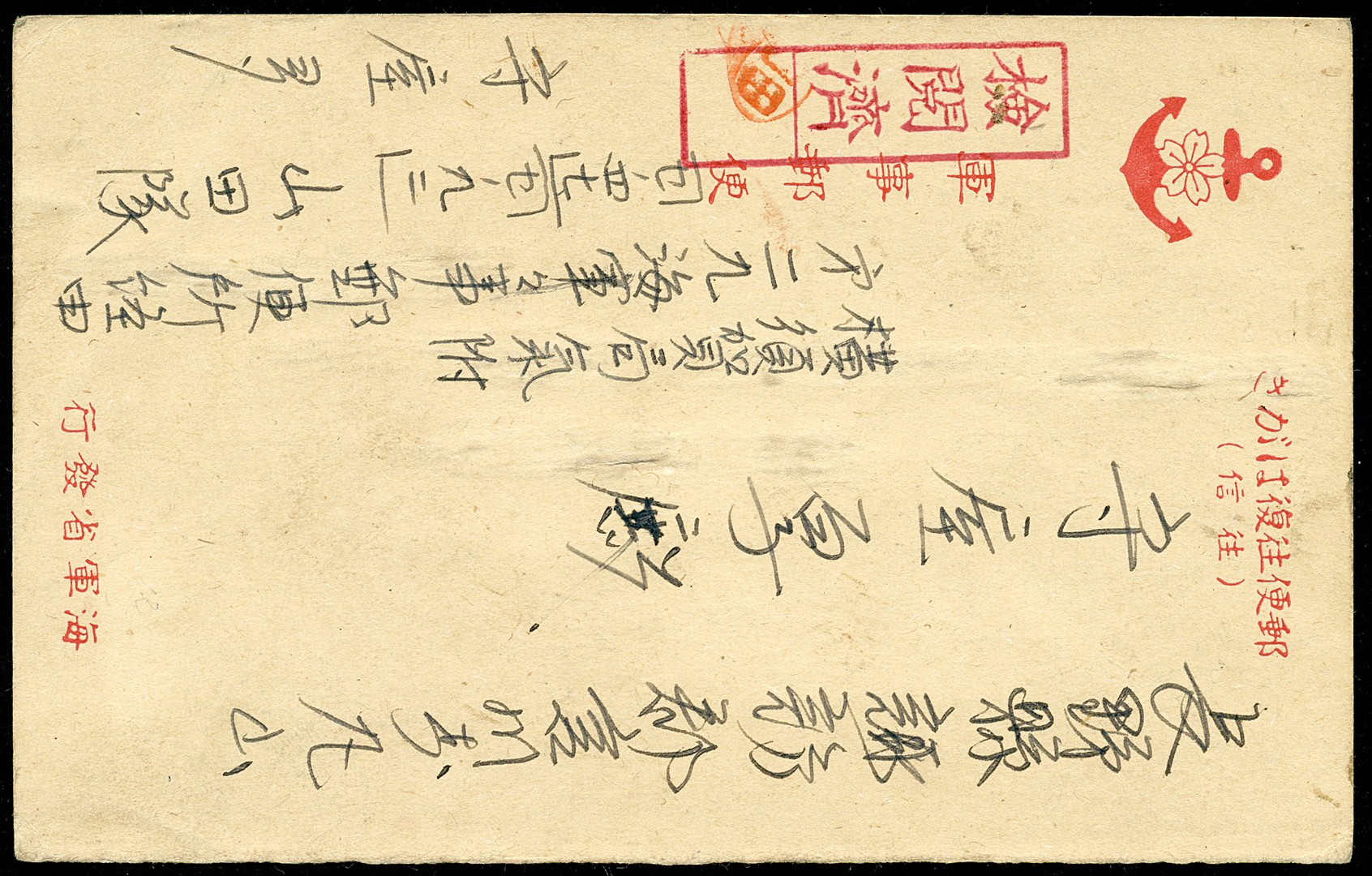 Japanese Military fieldpost reply card Bu.F24 from Kaimana, occupied Dutch New Guinea (Se 47, Se 92 Yamada group, 232nd construction unit) through Yokosuka navy department # 29 (navy office mail which was at Kaimana from 16 Sep 1943 until 21 March 1944) to Nagano. Two part censor mark Ken Etzu Zumi in rectangle with censor chop Yamada. Message from father to sons wishing a Happy New Year and saying he is fine. Mail from Kaimana is extremely rare. Ex Jennings