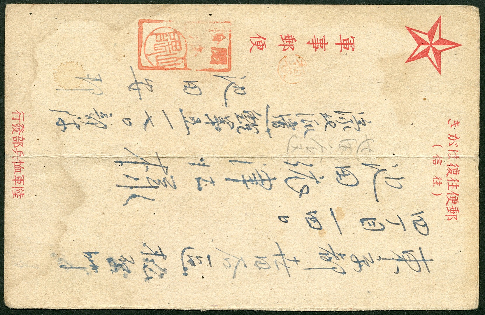 Japanese Military fieldpost reply card Bu.F3 from occupied Dutch New Guinea, unit 5170 = 21st Water Supply and Purification Department attached to the 2nd Army, sent to Tokyo. Unlisted censor mark with chop Yamazumi and Kasuya. Text includes he heard about the fierce battle at Leite and the bombing raid on Tokyo. He hopes all are well and writes he received a letter saying his uncle had passed away. Also writes he sent his salary to his wife on January 20 and hopes they receive this card before April 12th. Card was written begin 1944. Ex Jennings