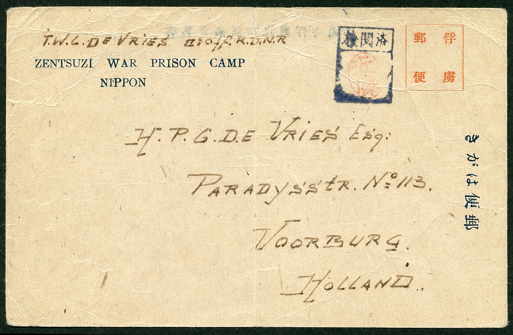 POW card Bu.29 written in June 1945, sent from the Zentsuzi POW Camp in Japan to Voorburg. Ex Hiegentlich