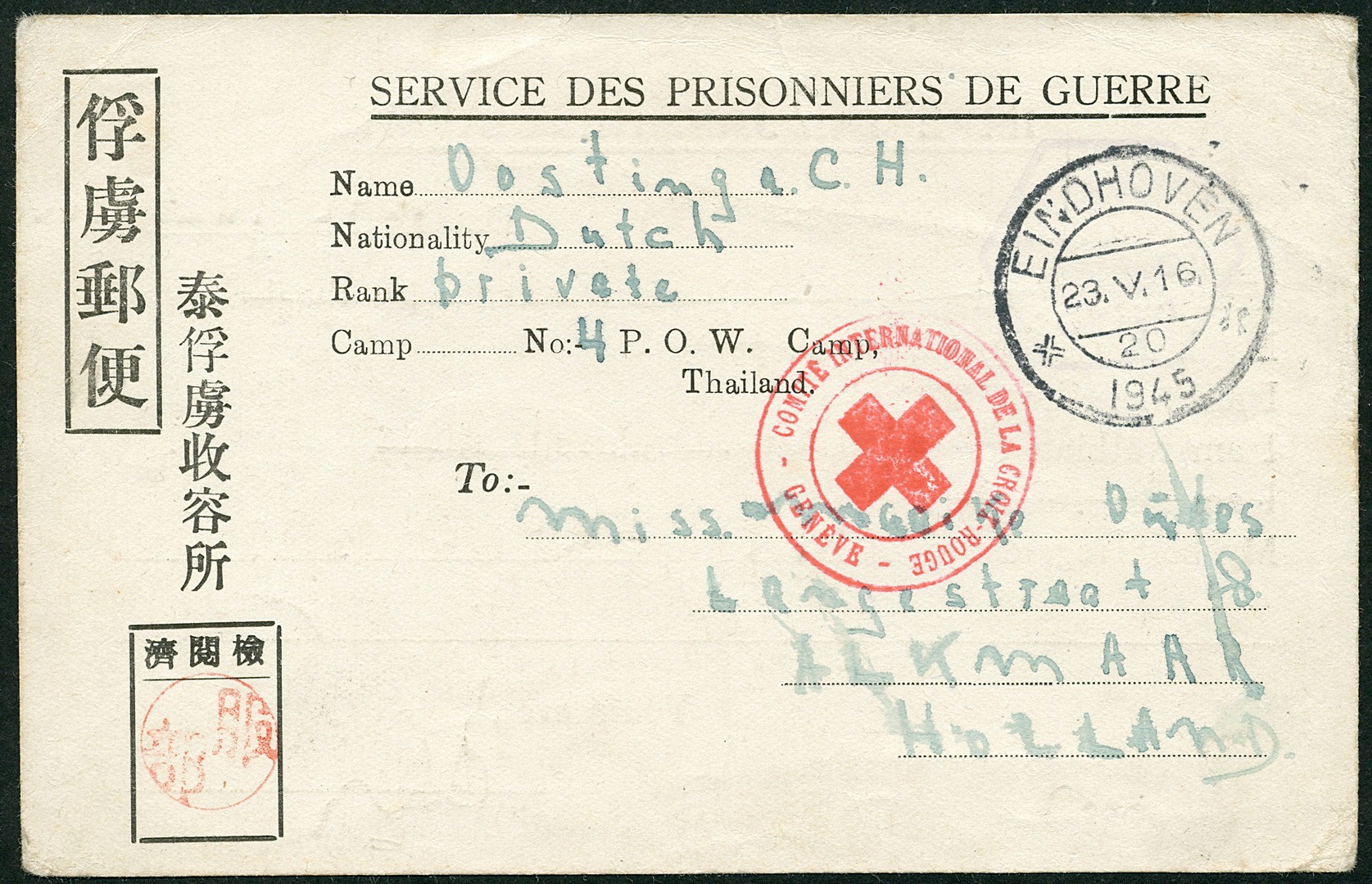 POW card Bu.PW42 written on June 10th, 1944, from a Thai Camp through the International Red Cross in Geneva via Eindhoven, the temporarely PTT Headquarters of Liberated Southern Netherlands, to Alkmaar. Such POW cards that arrived in Europe are extremely rare