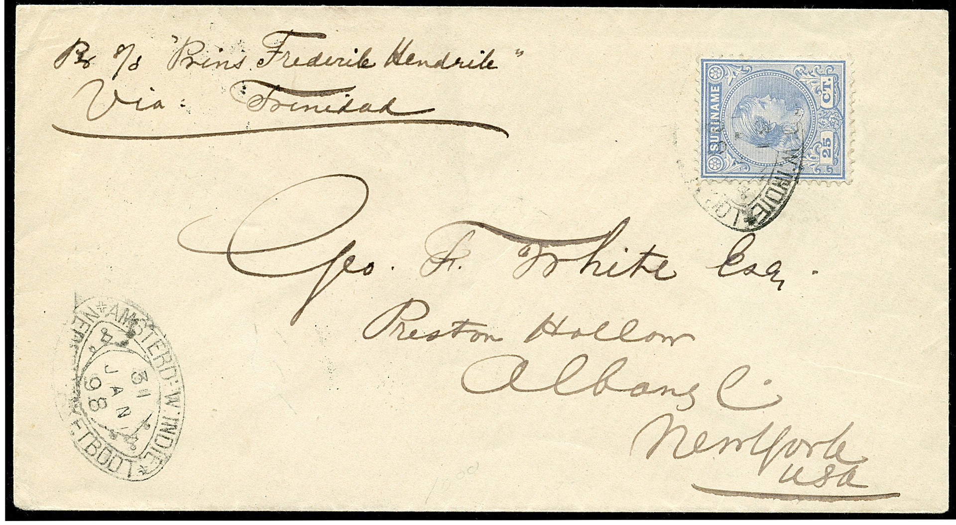 25 Cent Hangend Haar afgest. met ovaal KWIM-stempel 31-1-1898 met de ´Prins Frederik Hendrik´ over Trinidad en New York 31-1 naar Albany bij Middleburg 1-2