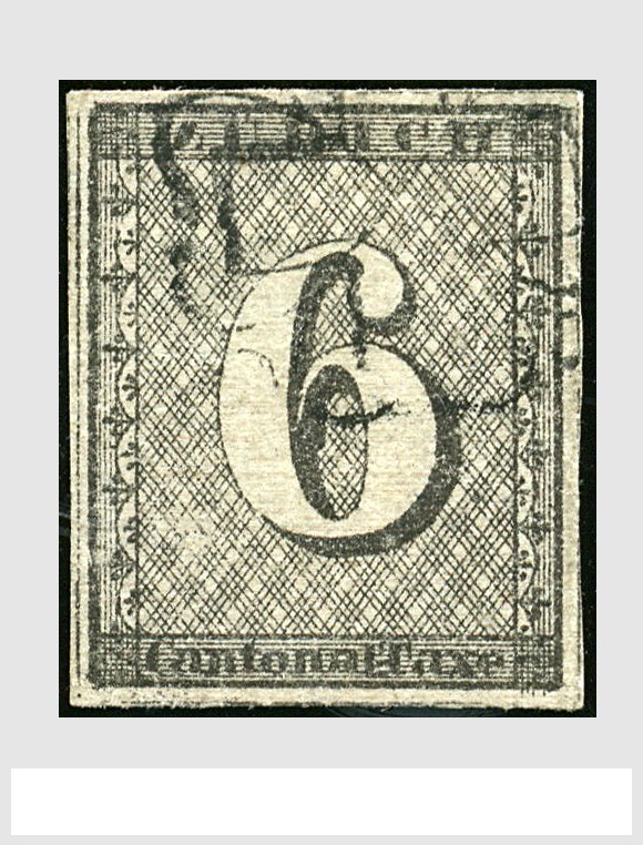 ZWITSERLAND, Kanton Zürich, Mi.2-II (Zu.2W), 6 Rp. schwarz, waagerechter roter Linienenunterdruck, gestempelt mit schwarzer Zürich-Rosette in einwandfreier Erhaltung. Attest Rellstab (1998) € 1500