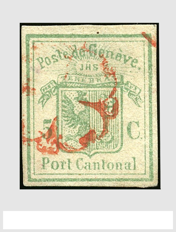 ZWITSERLAND, Kanton Genf, Michel GAA1 ( Zu. 07) Ganzachenausschnitt 5c. grün auf gelbliches Papier, gestempelt mit roter Rosette, breitrandiges sauberes Exemplar, signiert Fritz Moser. € 3000,-