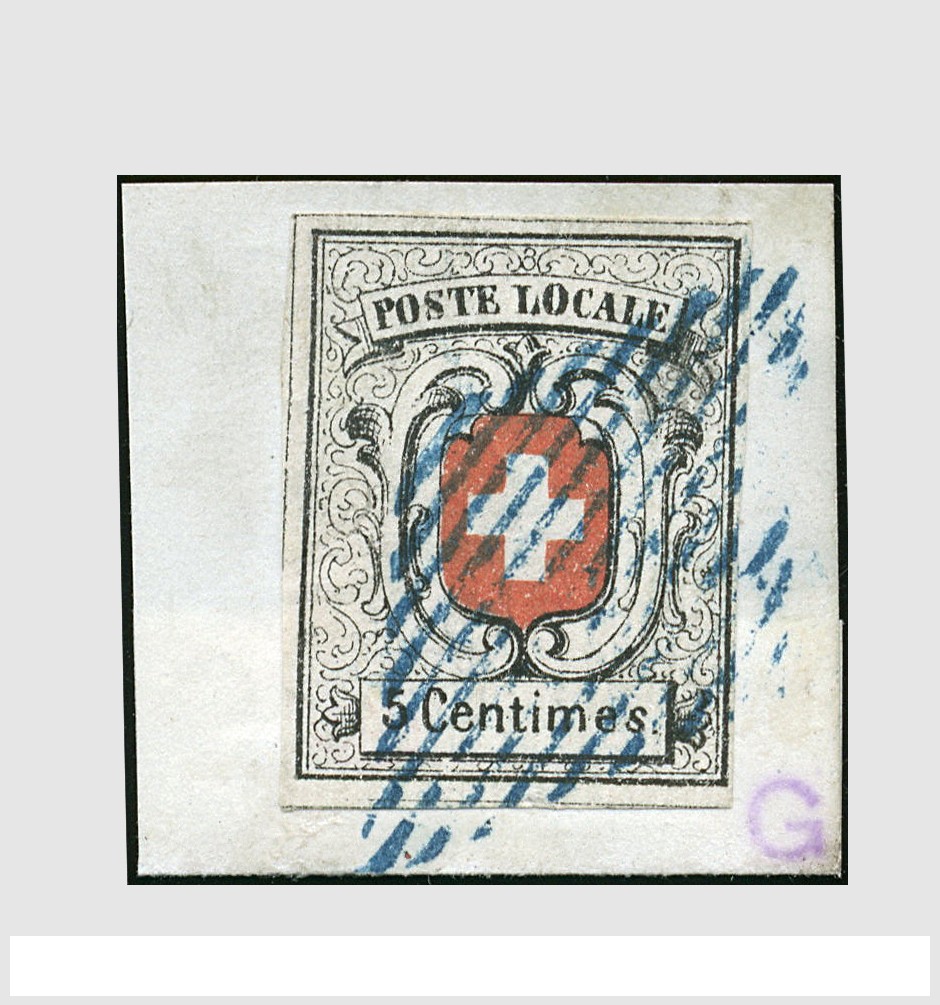 ZWITSERLAND, Übergangsmarken. Kanton Genf Michel 3 (Zu. 11) sogen, 'Neuenburg' 5c. schwarz/rot auf Briefstück entwertet mit blauem Rautenstempel, tadellos Erhalten mit Prüfungsschein VSPV