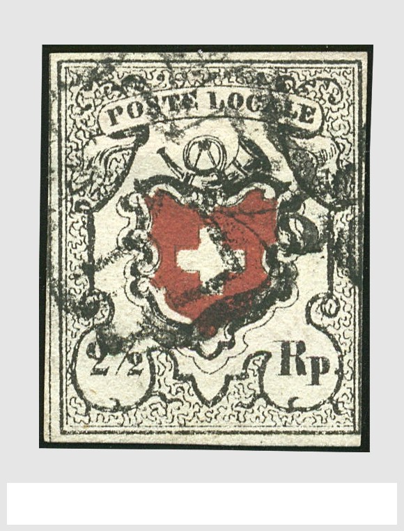 ZWITSERLAND, Bundesmarken Michel 6I (Zu. 14I), Poste Locale mit Kreuzeinfassung 2½ Rp. schwarz/rot, dreiseitig breitgerandet, farbfrisch und sauber entwertet mit schw. Zürcher Rosette mit Befund Fritz Moser (1974)