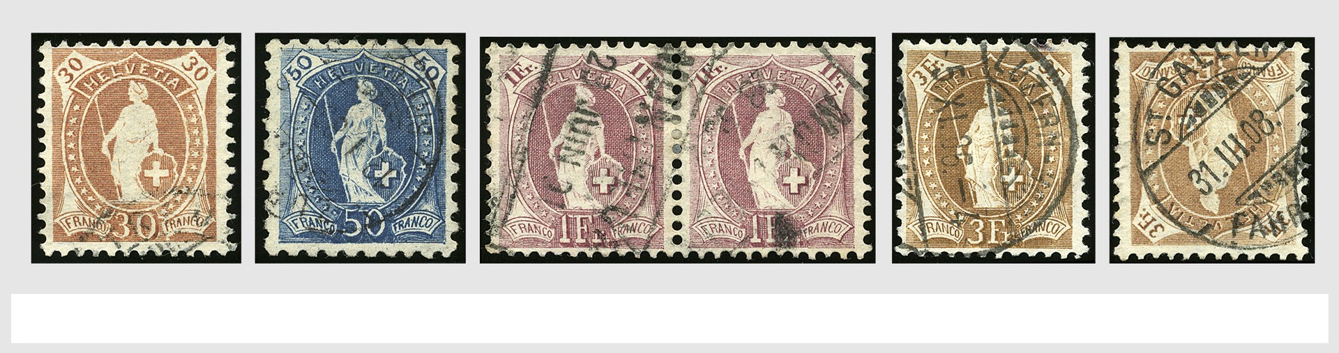 ZWITSERLAND, Staande Helvetia 1882-1907, gebruikt wb. Zumstein 96B, 70B, 71E in paar en 92A met attest Renggli, cat.wrd. CHF. 2425