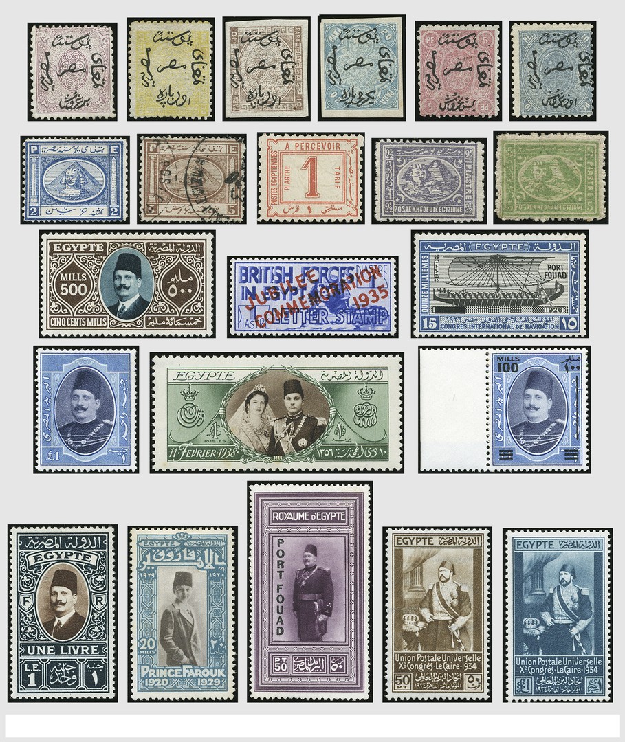 EGYPTE 1866-1967, o/*/** zeer mooie, uitgebreide collectie, veelal dubbel verzameld gebr. en ongebr. in 2 klembanden met zeer goede nrs. en series o.a. Mi. 93, 104, 112/115 Port Fouad met diverse keuren, 136/137, 148/151, 156/157, 159, 191/204, 247 etc. Tevens Port, Dienst, en Blokken. Hoge cat. waarde!