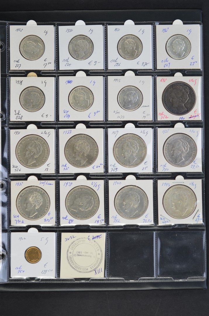 NEDERLAND, verzameling Wilhelmina in album waarbij 5 gulden 1912, 2½ gulden 1898 en 2½ gulden 1938 Grof Haar