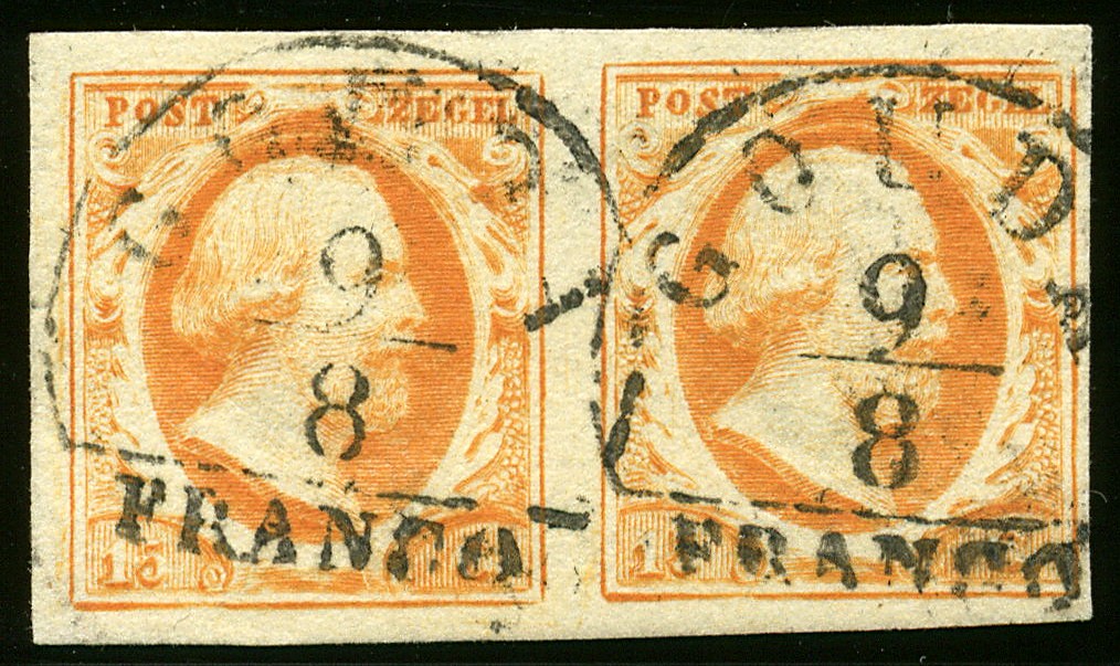 GOUDA A (EY.250) op 15 cent nr. 3b, pos. 9/10. Aan drie zijden zeer breed gerand prachtpaar met op elke zegel een volledige afst. Zeldzaam in deze kwaliteit! Ex Reed, John de Leeuw
