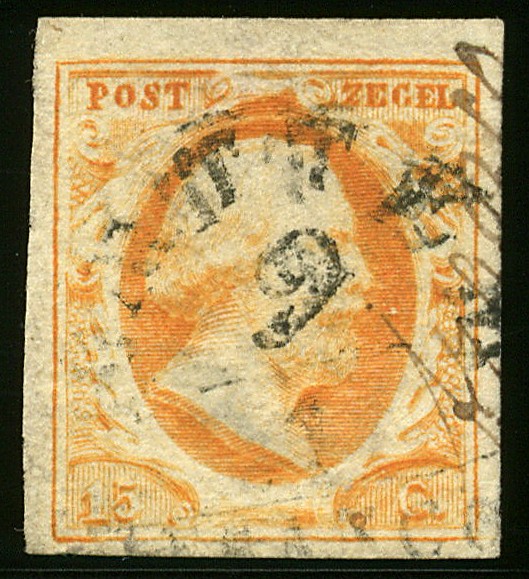 HATTEM A (EY.RR) met aan de rechterkant geschreven ´franco´ op 15 cent. Prachtex. met volledige, wat bewogen waardoor dubbele afst. Zeer zeldzaam op deze zegel en slechts enkele ex. bekend