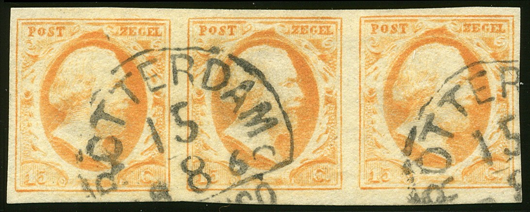 ROTTERDAM C met liggende 0 van het jaartal 60 op 15 cent nr. 3c, pos. 91/93. Mooi tot breed gerande strip van drie waarop prachtige afst.