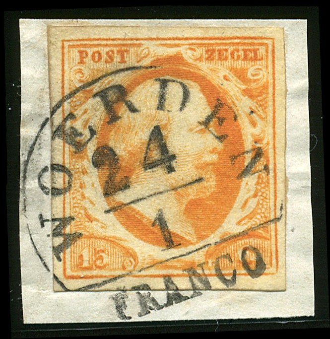 WOERDEN A (EY.800) op 15 cent nr. 3b, pos. 19. Prachtex. op knipsel met volledige afst.