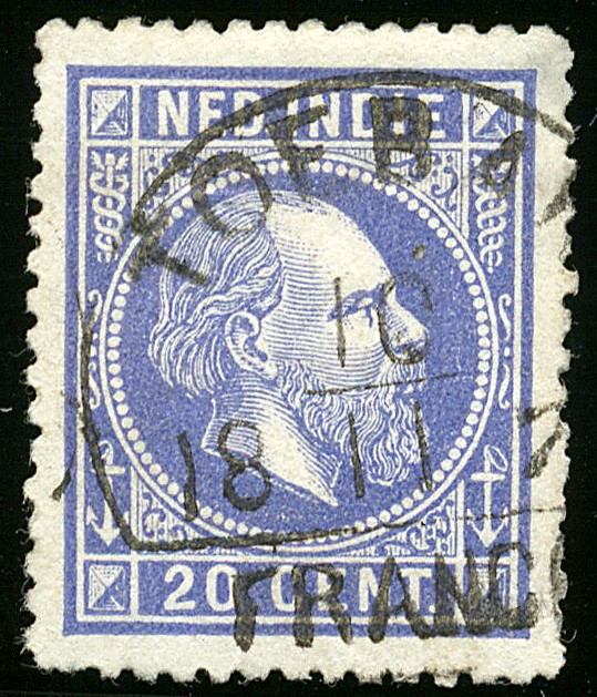 Halfrond-franco TOEBAN op 20c nr. 12A. Vr. prachtex. met nagenoeg volledige afst. van dit op deze emissie uitermate zeldzame stempel, waarvan slechts enkele ex. bekend zijn (V.500)