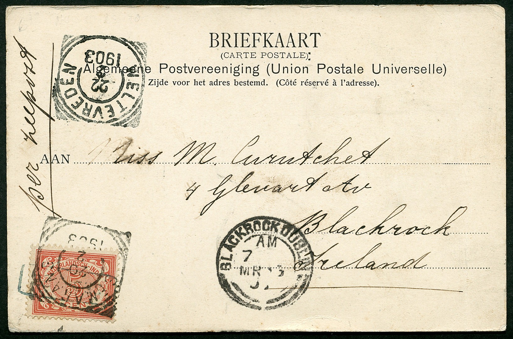 IERLAND. Prentbk. gefr. met 5c, in blauw licht afgest. met haltestempel Sedajoe, via Semarang 20-2-1903 en Weltevreden naar Blackrock Dublin 13-3