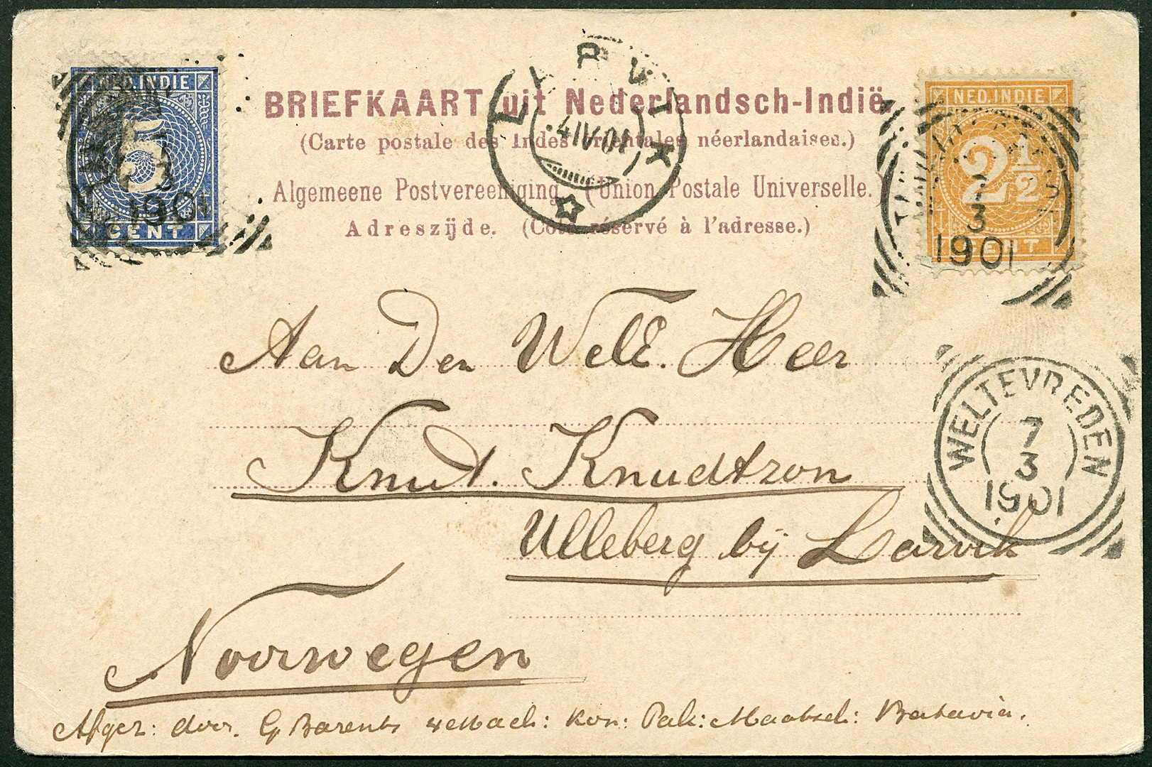 NOORWEGEN. Prentbk. gefr. met 2½c en 5c van Tandjongpriok 7-3-1901 over Weltevreden naar Knut Knudtzon bij Larvik 4-4