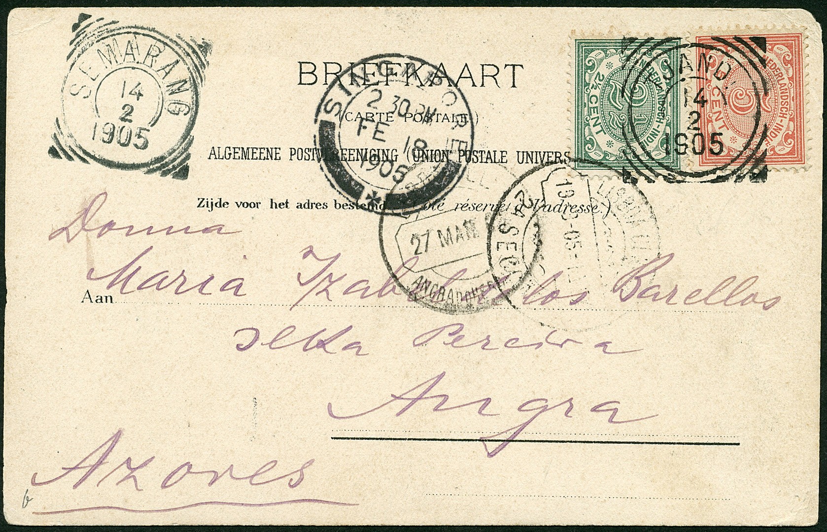 PORTUGAL. AZOREN. Prentbk. gefr. met 2½c en 5c van Tjandi 14-2-1905 via Semarang en Singapore 18-2 over Lissabon 19-3 naar Angra do Heroísmo 27-3. Zeldzame bestemming!