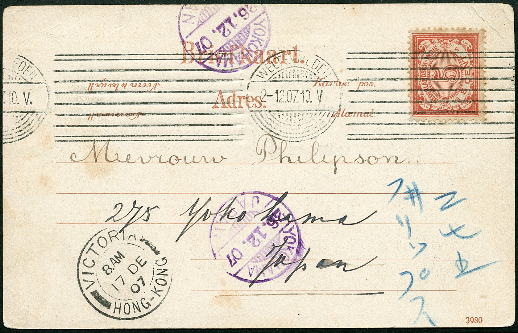 AZIË. JAPAN. Drie prentbk. gefr. met 5c, twee uit Weltevreden 1907 via Hong Kong naar Yokohama, en uit Bandoeng 5-6-1909 naar Tokio 29-6
