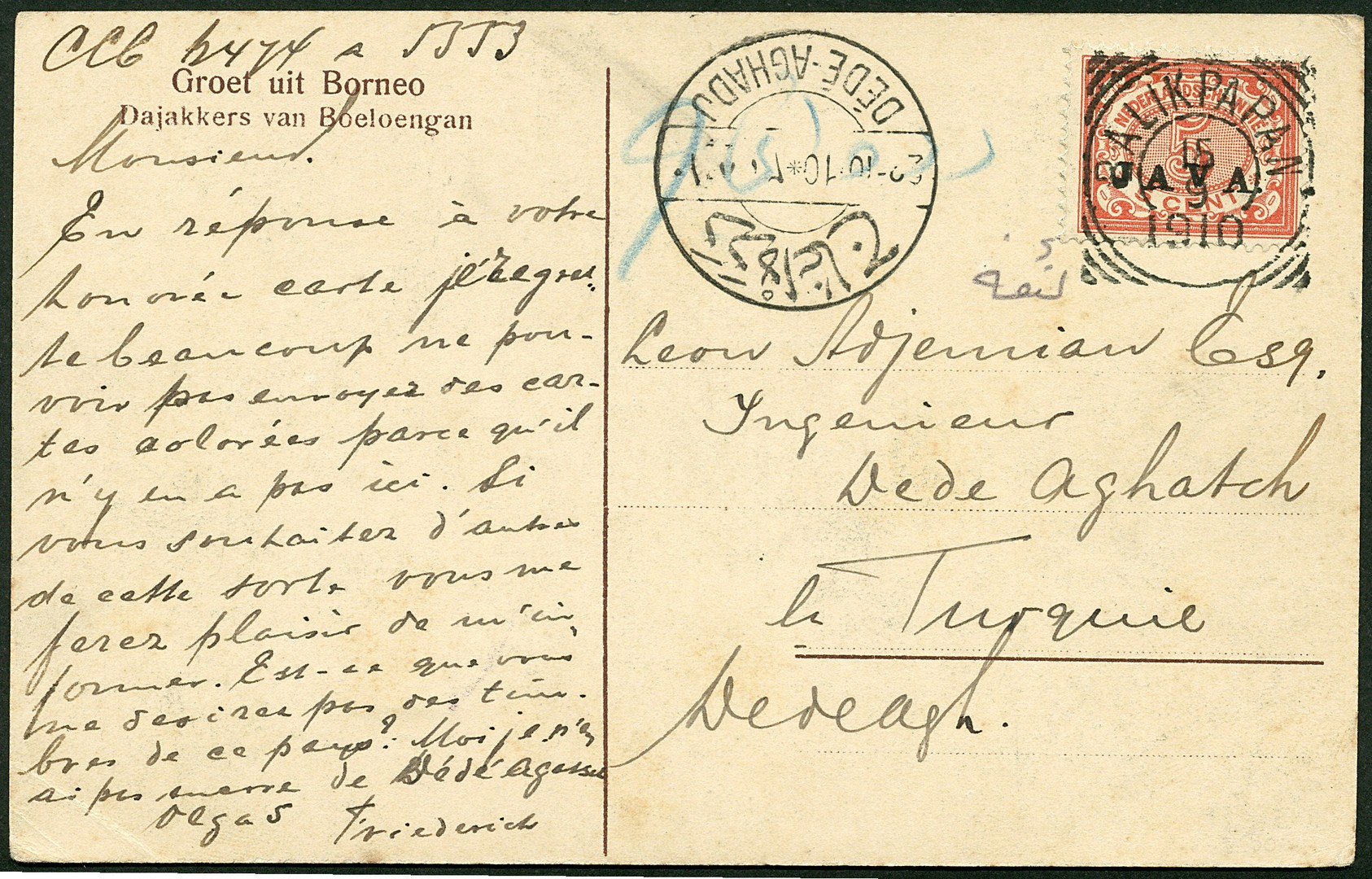 AZIË. TURKIJE. Twee prentbk. gefr. met 5c van Weltevreden 9-8-1907 met de Franse pakketboot Yokohama à Marseille over Port Said 29-8 naar Constantinopel, alsmede gefr. met 5c met Java.-opdruk van Balikpapan 15-9-1910 naar Dédé-Aghadj 22-10