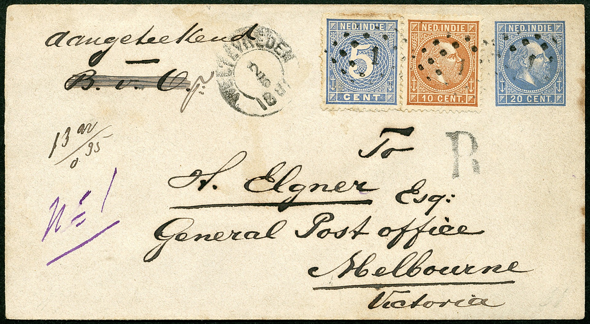 AUSTRALIË. VICTORIA. Env. G2 bijgefr. met 5c en 10c van Weltevreden 2-5-1891 aangetekend naar Melbourne 28-5. Post naar Australië is schaars!