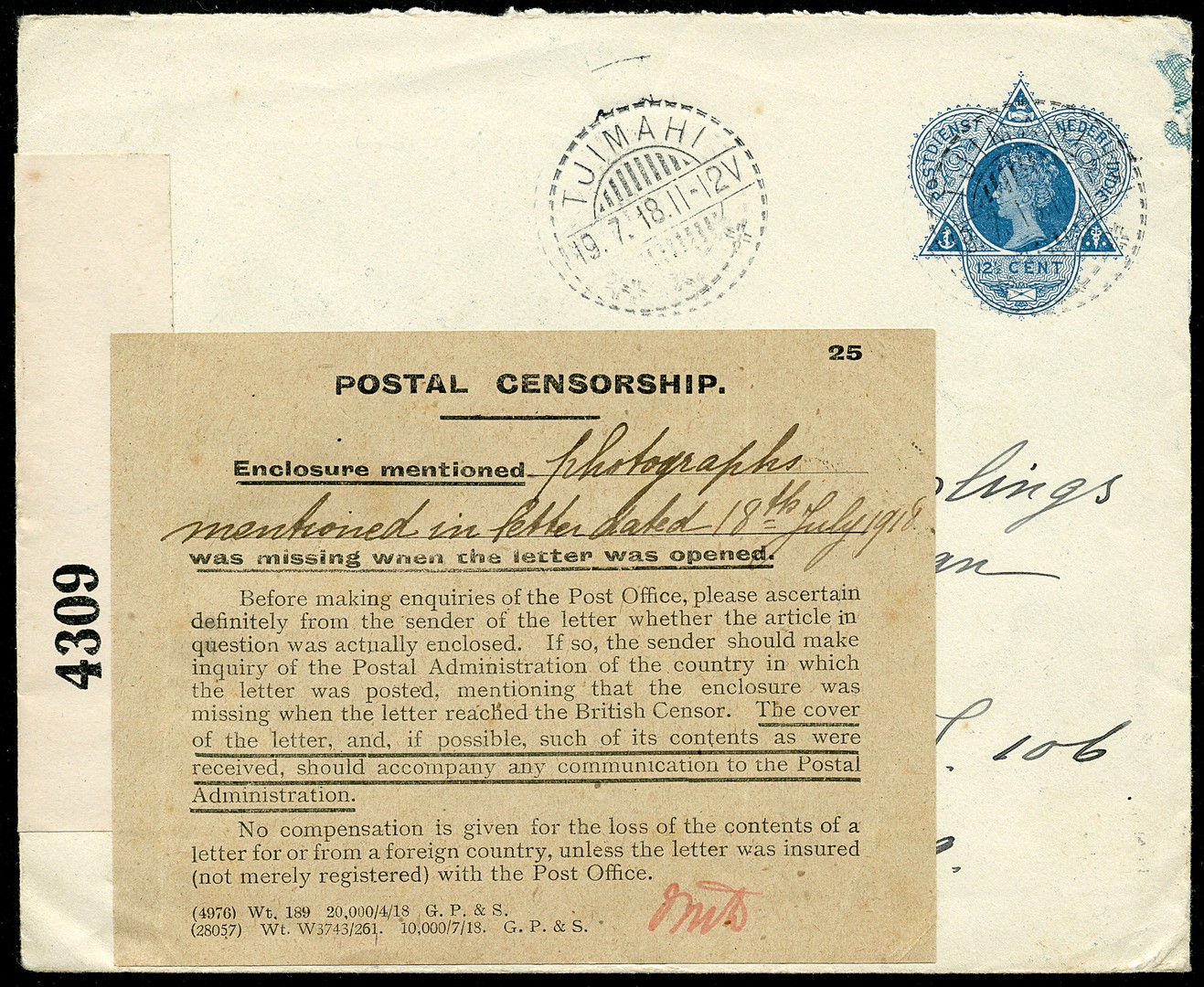 Env. G27 (rechtsboven schaafplekje) van Tjimahi 19-7-1918 naar ´sGravenhage 1-11, door de Engelsen gecensureerd en voorzien van etiket met de mededeling dat de ingesloten foto´s, waarover in de brief wordt geschreven, niet door de censuurdienst zijn aangetroffen, en hoe nu verder te handelen. Dit etiket hebben wij nog niet op een ander poststuk aangetroffen