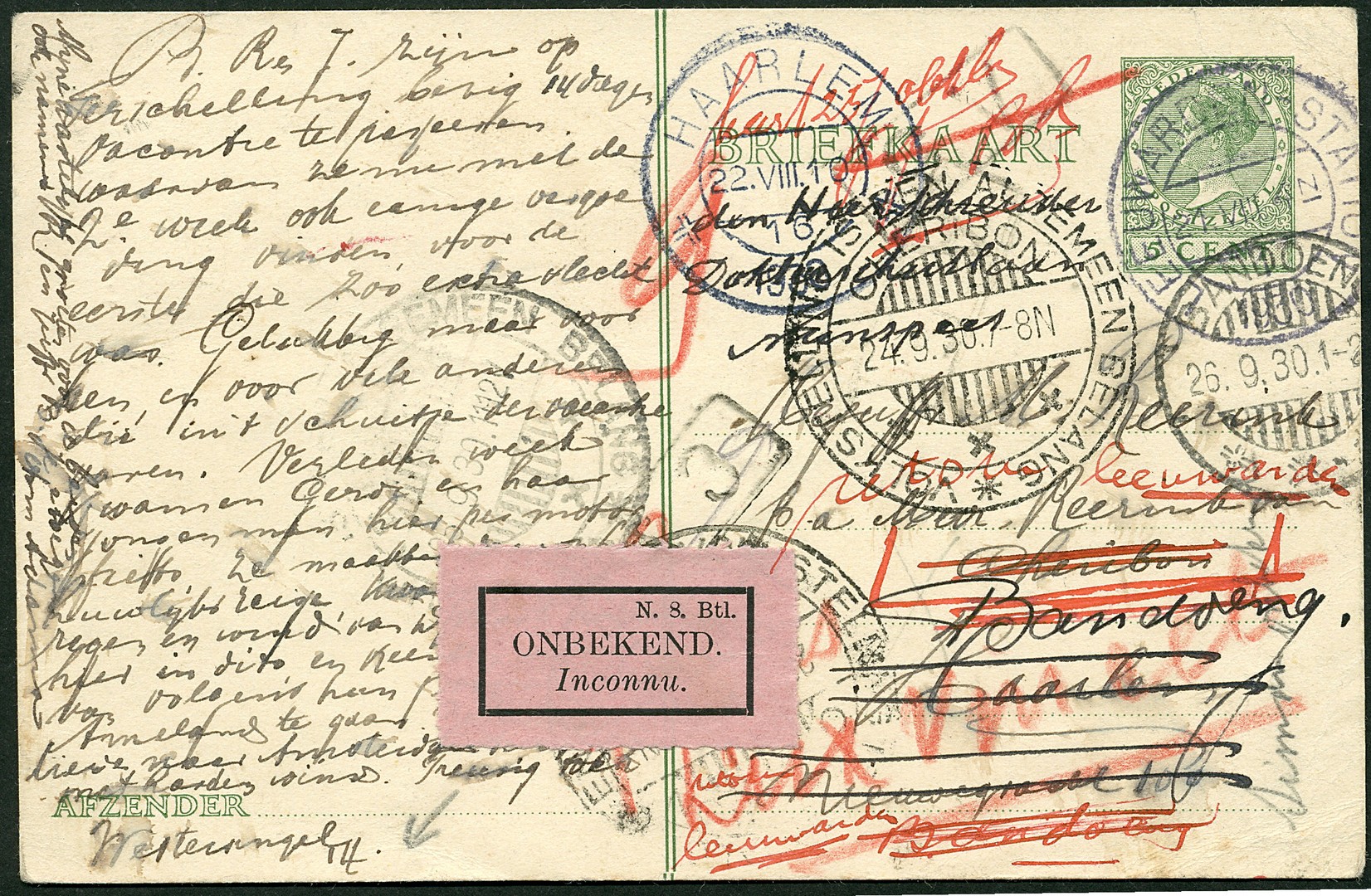 Roze etiket ´Onbekend./Inconnu.´ op bk. uit Leeuwarden 21-8-1930 op zoek naar de geadresseerde, met o.a. mooi propagandastempel voor de Volkstelling van Cheribon