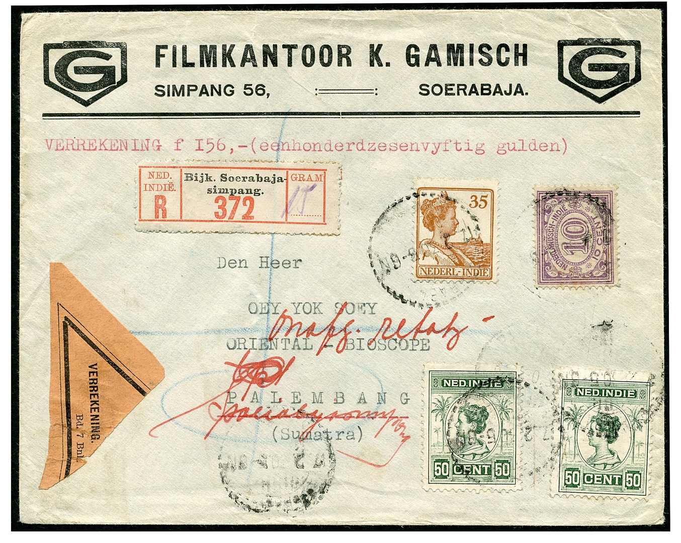 Rembours. Env. gefr. met 10c, 35c en 2x 50c als verrekenzending op 17-2-1930 van Soerabaja-/Simpang naar Palembang, daar op 20-2 retour want niet afgehaald. Remboursstukken van Indië zijn bijzonder schaars!