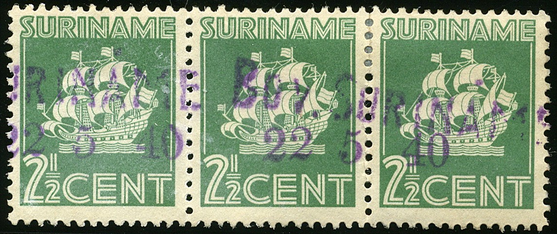 Stempel van het Gemengd Bedrijf Vaartuigendienst ´Bov.Suriname´ waaronder datumstempel ´22 5 40´ in violet, ES. type 6.4.2.a1, op 2½c scheepje in strip van drie (tanding tussen rechter zegels bijna los, rechter zegel az. iets getint)