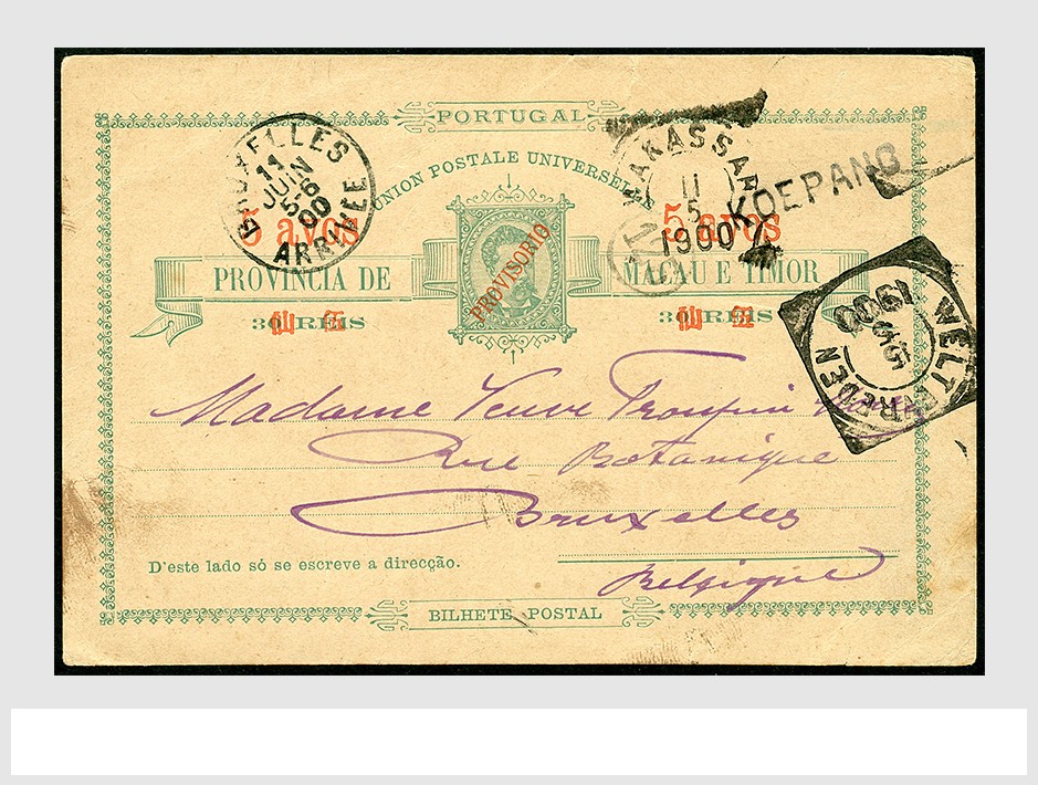 PORTUGUESE TIMOR. To Belgium. Postcard of 5 avos on 30r from a son to his mother, written at Dilly on 3 May 1900, however posted at the sub-post office KOEPANG in the Dutch part of Timor (straight-line pmk) via Makassar 11 May and Weltevreden 15 May to Brussels 11 June. Most interesting
