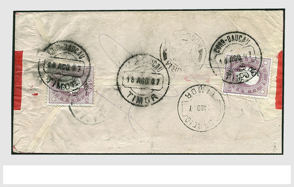 PORTUGUESE TIMOR. To Hong Kong. 5 avos on 25r two copies on Chinese cover from Baucau 18 Aug 1907 via dilly 22 Aug and Soerabaja 21 Sep to Hong Kong (arrival date not readable)
