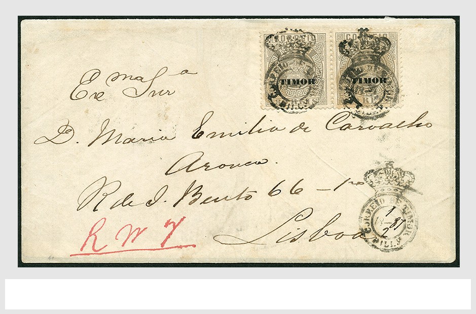 PORTUGUESE TIMOR. To Portugal. 80r in very fine pair on a registered cover both tied by Crown pmk Dilly 1 Feb 1887, partly in manuscript (the date), with an extra strike on the right, to Lisbon 26 Mch 1887. On the back written 'Registrada'. A very rare cover in wonderful quality and only a few recorded from the Crown issue period. Timor early covers are the rarest of all Portuguese Colonies. Ex Gonzales-Garcia of Frazao
