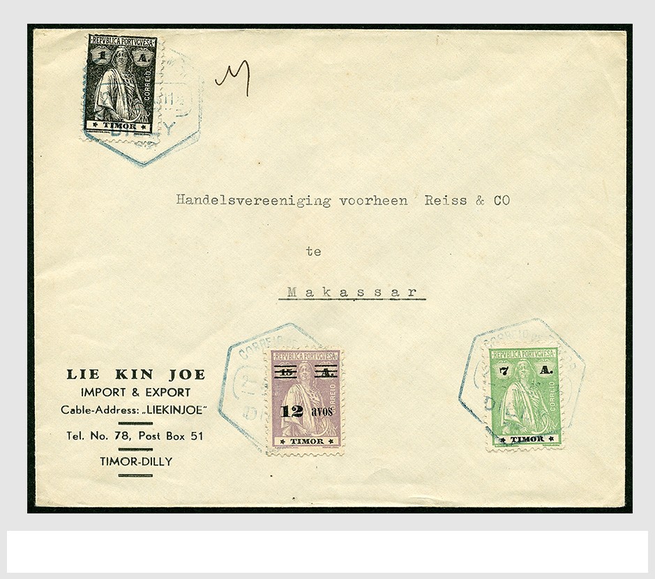 PORTUGUESE TIMOR. To the Netherlands East Indies. 1a, 7a and 12a on 15a as a three colour franking on a business cover from Dilly 2 May 1935 to Makasser 8 May
