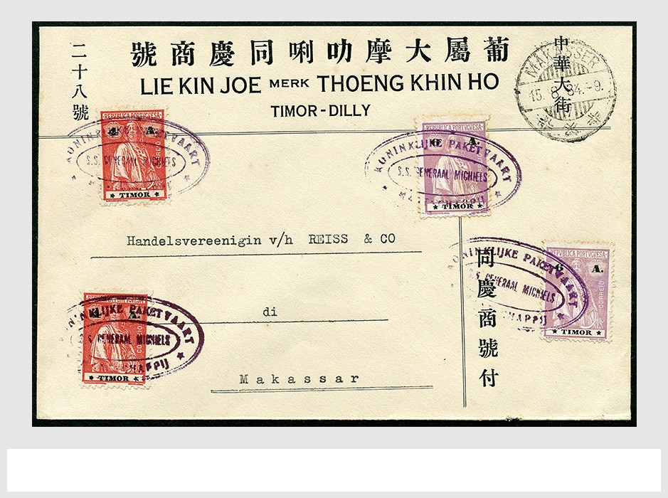 PORTUGUESE TIMOR. To the Netherlands East Indies. 4a and 6a (two copies each) on business cover sent by the KPM (= Royal Packet Line) vessel 'S.S. GENERAAL MICHIELS' to Makasser 15 Aug 1934. Highly attractive piece