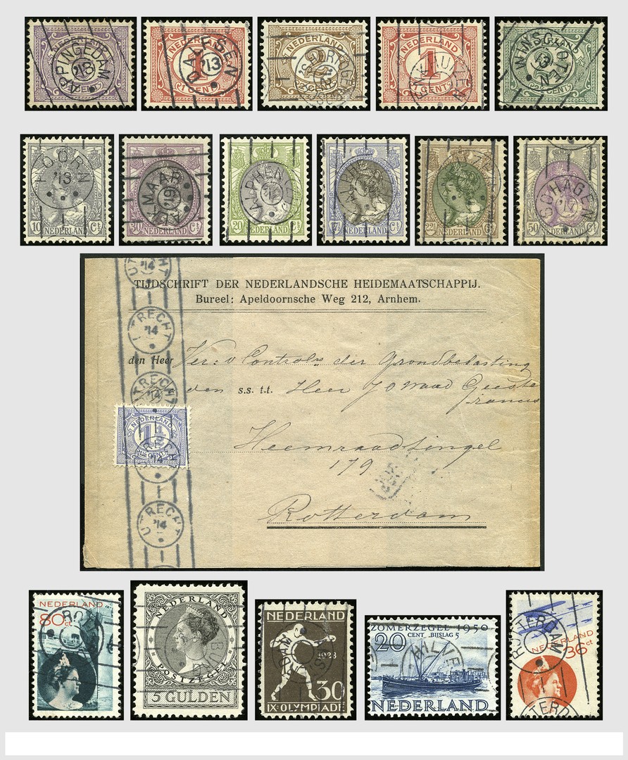 DRUKWERKROLSTEMPELS, zeer omvangrijke collectie verzameld op kantoornaam, jaartal, allerlei waarden en emissies, op losse zegels en/of knipsels, in paren, strippen, blokken, veldelen, met wat variaties, enkele stukken, dit alles alfabetisch gesorteerd in 2 Lindner-ringbanden. In deze omvang moeilijk meer bijeen te brengen, een prachtobject om op te zetten als tentoonstellingscollectie!