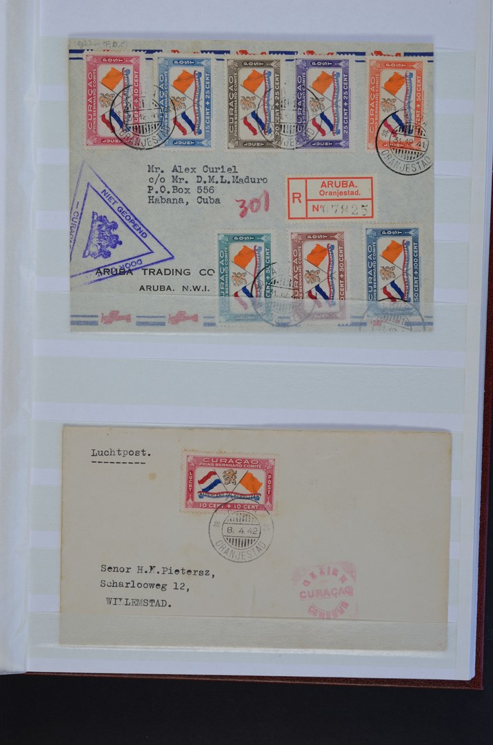 CURAÇAO/NED. ANT. POSTHISTORIE, 41 poststukken 1941-55 veelal met (series) luchtpostzegels w.o. LP18/25 op envelop en mooie (enkel)frankeringen, bestemmingen, div. censuurkenmerken, incl. 5 max.kaarten nrs. 248/252, in insteekboek