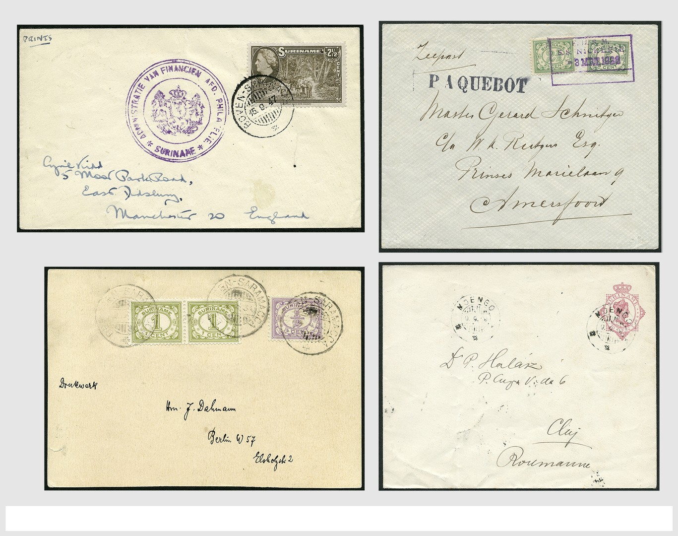SURINAME, ruim 400 poststukken ca. 1879-1975 met stempels, scheepspost, luchtpost, (enkel)frankeringen, bestemmingen, aangetekend (o.a. 2 op rivierbootdienst), censuur, etc. in 3 Lindner-ringbanden
