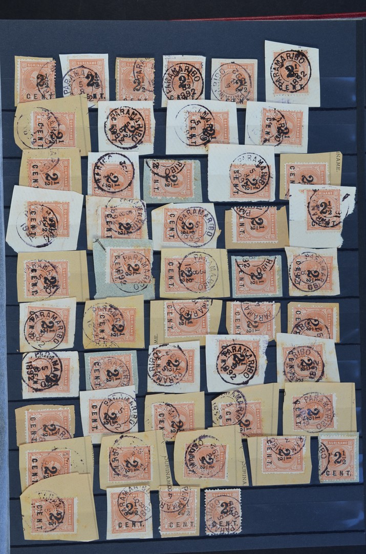 SURINAME, Opdrukzegels 1892-1950, speciaalcollecties nrs. 21, 37-38, 60-61, 63, 111-114, 116, 210-213, 245-246, 284 en LP24 incl. 24f, in grote aantallen o/*/** zowel los, paren, strippen, blokken, veldelen en enkele vellen, waarbij opdrukvariëteiten, toevalligheden, plaatposities, diversen en met veel extra gedocumenteerde informatie, in 5 insteekboeken. Mooi studieobject!