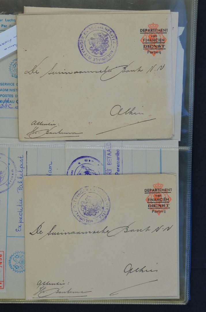 SURINAME, ca. 110 dienststukken jaren ´40-´80 waarop ronde, violette stempels van diverse officiële instanties, portvrij verzonden of met zegels gefrankeerd w.o. aangetekend