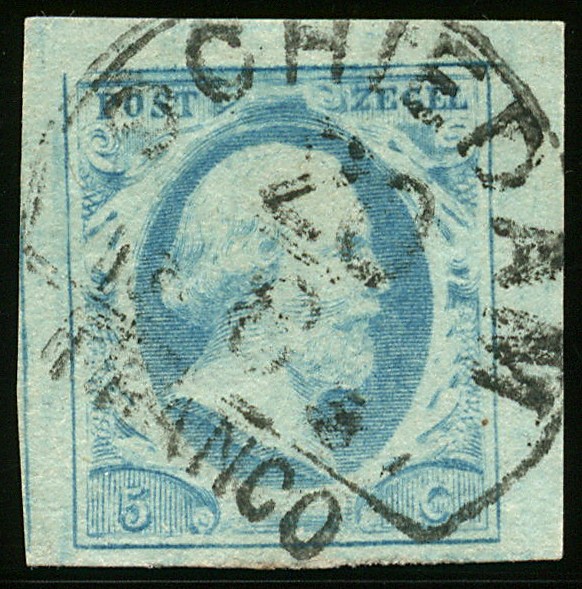 SCHIEDAM C groot (EY.75) op 5 cent nr. 1k-Pl.III-100. Breed tot zeer breed gerande prachtzegel met complete afst.