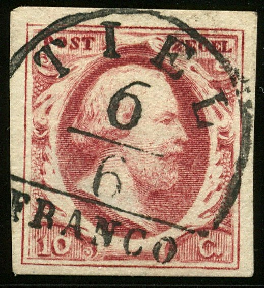 TIEL A (EY.50) op 10 cent diepdonkerkarmijn nr. 2a-Pl.I-47. Prachtzegel met ideale afst.