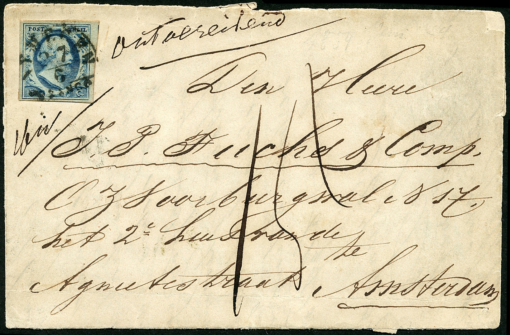 NYMEGEN A (EY.50) op 5 cent nr. 1f-Pl.II. Prachtex. op vouwbrief (az. iets los) van 27-6(-1854) naar Amsterdam 27-6, waar de ontvanger nog 15 cent moet betalen voor deze ontoereikend gefr. brief, 5 cent omdat het gewicht 16w is (dus 2e gew. kl.) plus 10 cent omdat de afstand meer dan 100 km bedraagt