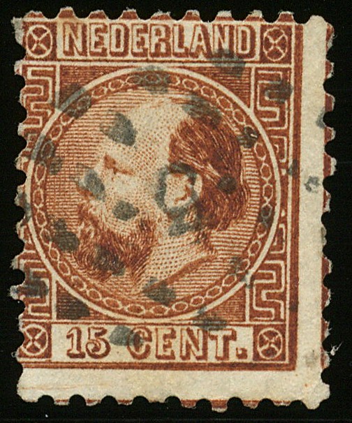 9IB, 15 cent oranjebruin in Kt. 10½ : 10¼ gr.g. Gebruikt vrijwel prachtex. Keur ´Ned. Bond´, cert. ´NVPH, 1958´. € 2000