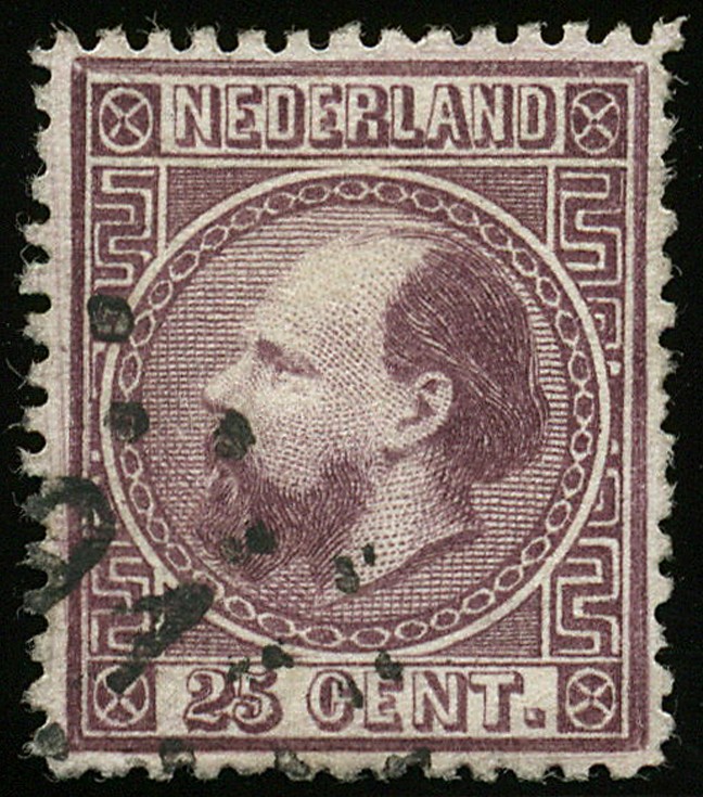 11IID, 25 cent donkerviolet, Lijntanding 14 kl.g., type II, gebruikt zeer fraai ex. met certificaat Moeijes (1990). Zeer zeldzaam zegel! € 5000